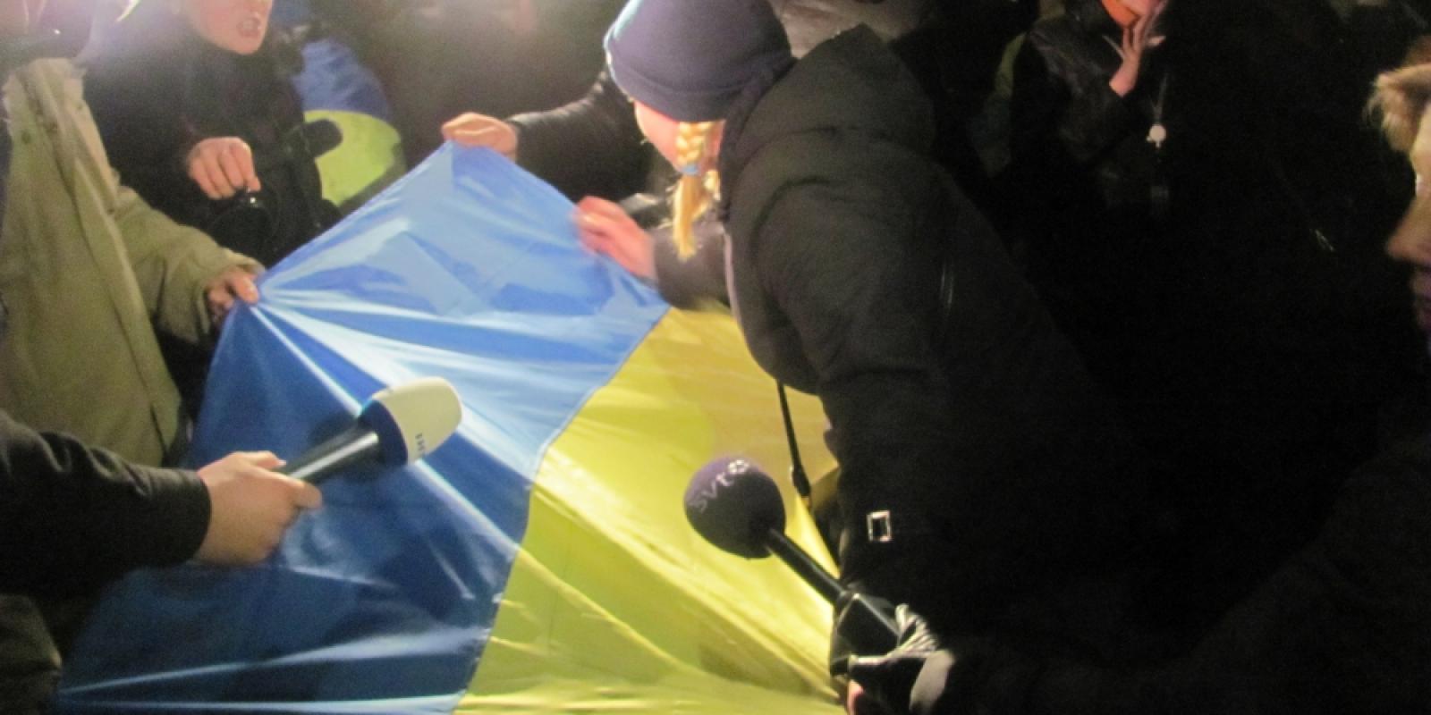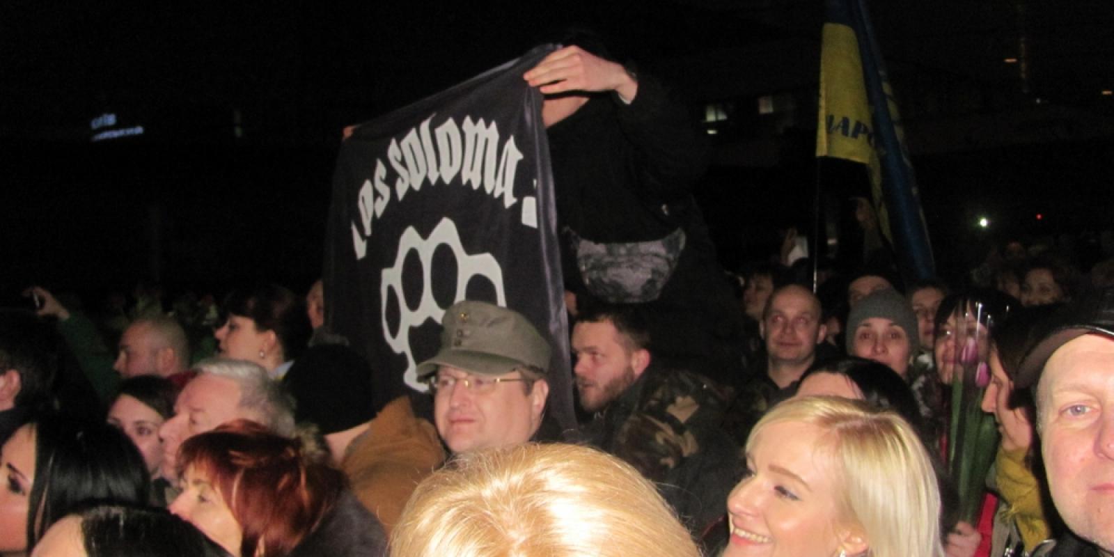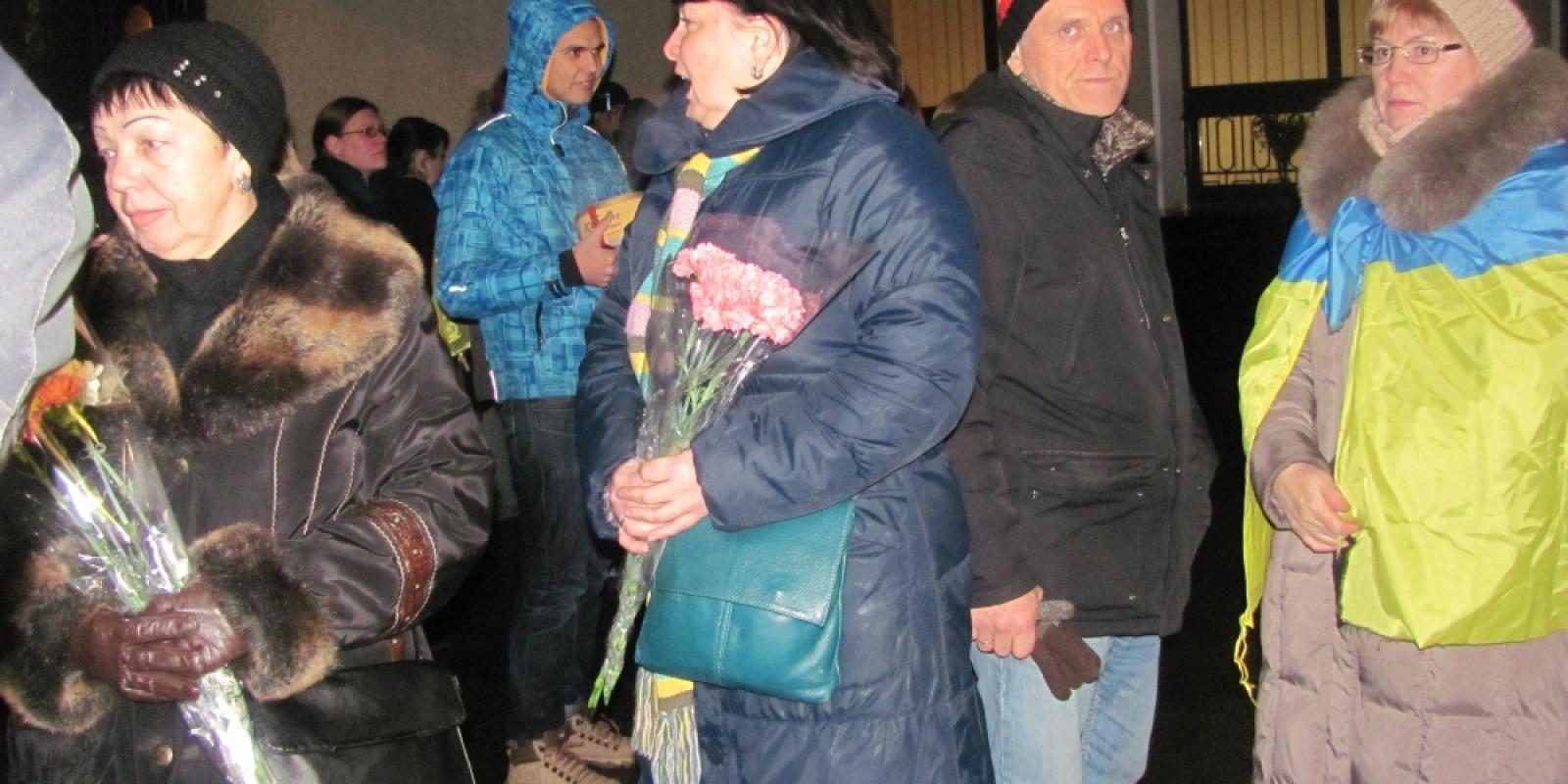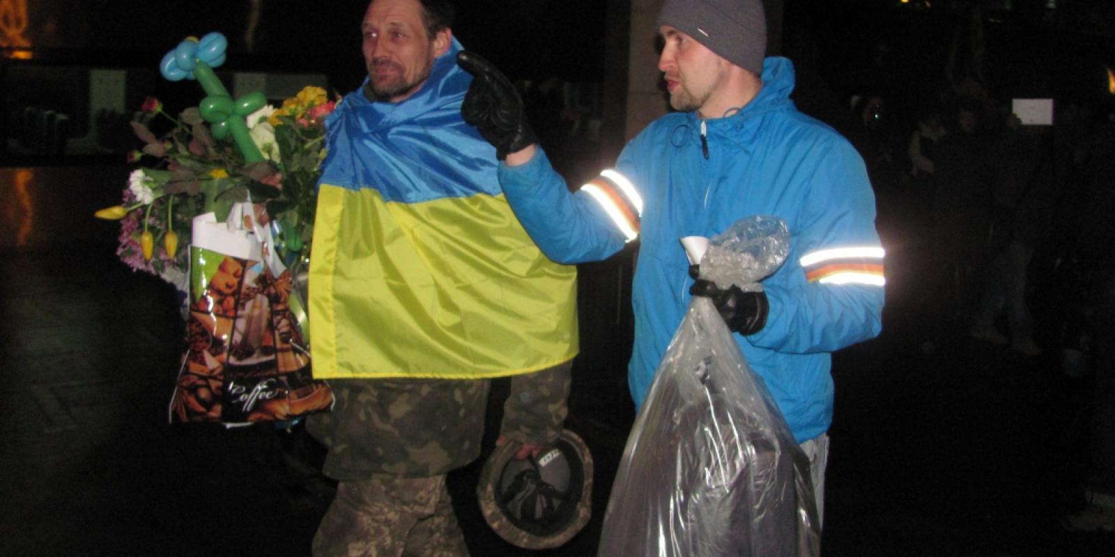 Накидають йому на плечі український прапор, обнімають, фотографуються разом. Взнають, що він немісцевий, забирають ночувати до себе.