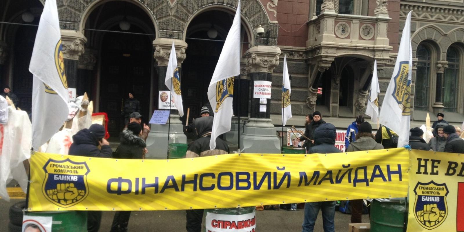 Громадяни виступають проти різкої девальвації гривні та вимагають у влади законодавчо зафіксувати курс валют на момент укладання кредитних договорів.