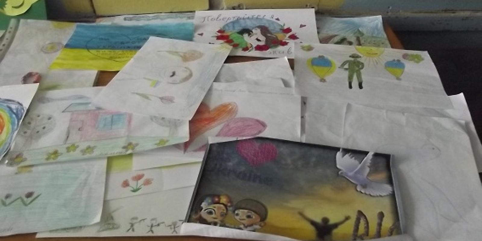 Бійці розповіли, що більш за все радіють дитячим малюнкам, які привозять волонтери. Вони навіть стіни бліндажу прикрашають ними, щоб кожної хвилини бачити надії та сподівання на мир маленьких художників. На цю зустріч правоохоронці передали яскраві привітання намальовані маленькими школярами.