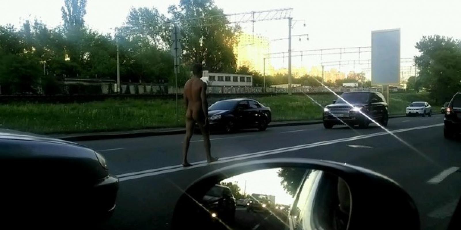 У Голосіївському районі Києва по центру проїжджої частини розгулював голий чоловік. Він йшов по дорозі по вулиці Миколи Грінченка, не звертаючи увагу на машини і сигнали світлофора.