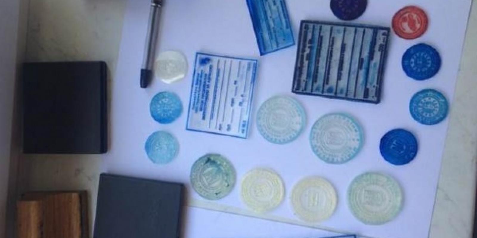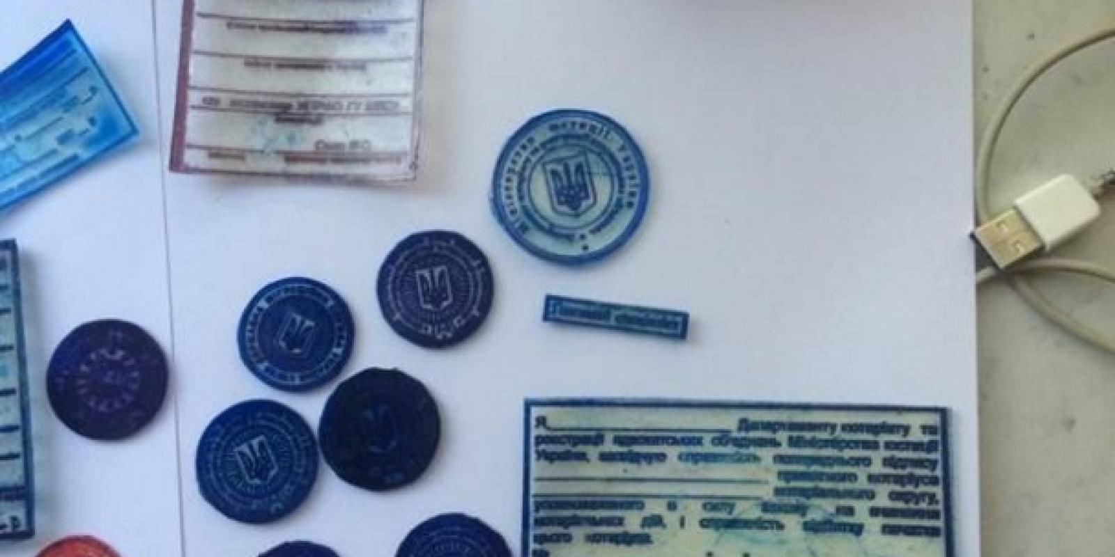 "Під час проведених Головним управлінням Служби безпеки України у Києві та Київський області обшуків помешкань учасників оборудки у Шевченківському, Голосіївському, Солом'янському районах столиці та в Київській області, було вилучено кліше 80-ти підроблених печаток кількох державних органів, вищих навчальних закладів та вже готові підроблені документи", - повідомила прес-служба СБУ.