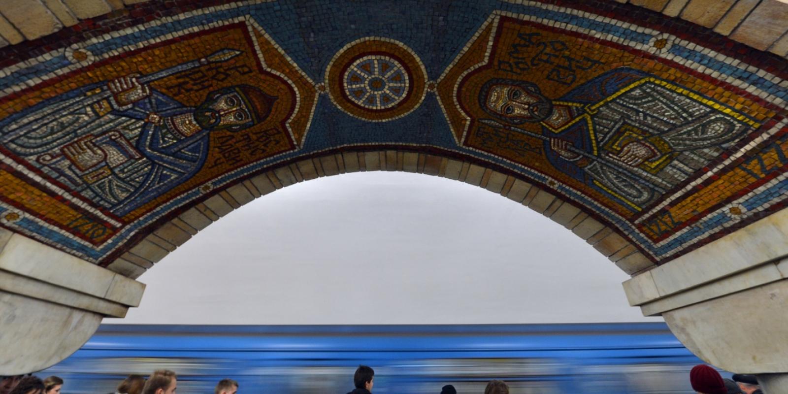 Сейчас его труднее заметить, но после открытия станции он был достаточно ярким. Стоит отметить, что на момент постройки станции Украина еще не была независимым государством, и художники рисковали, потому что лозунг «Слава Украине» было запрещено.