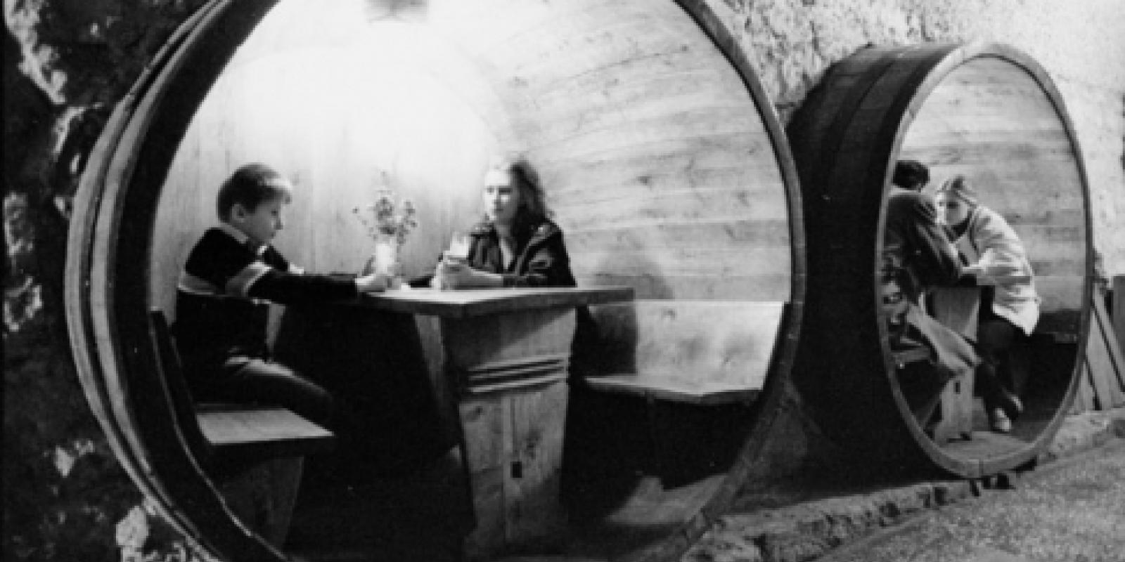 Столиков не было. Вместо них в стены вмонтировали огромные бочки, имитирующие емкости для вина. Внутри маленькие комфортные диванчики.