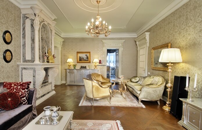 Цей стиль сподобається тим, хто любить розкіш. В обробці квартири використовується дорога деревина, ліпнина, кесони. Стіни обшиваються панелями, драпіруються світлим шовком. Меблі найчастіше компактні, плавної, іноді химерної форми, прикрашені різьбленням.