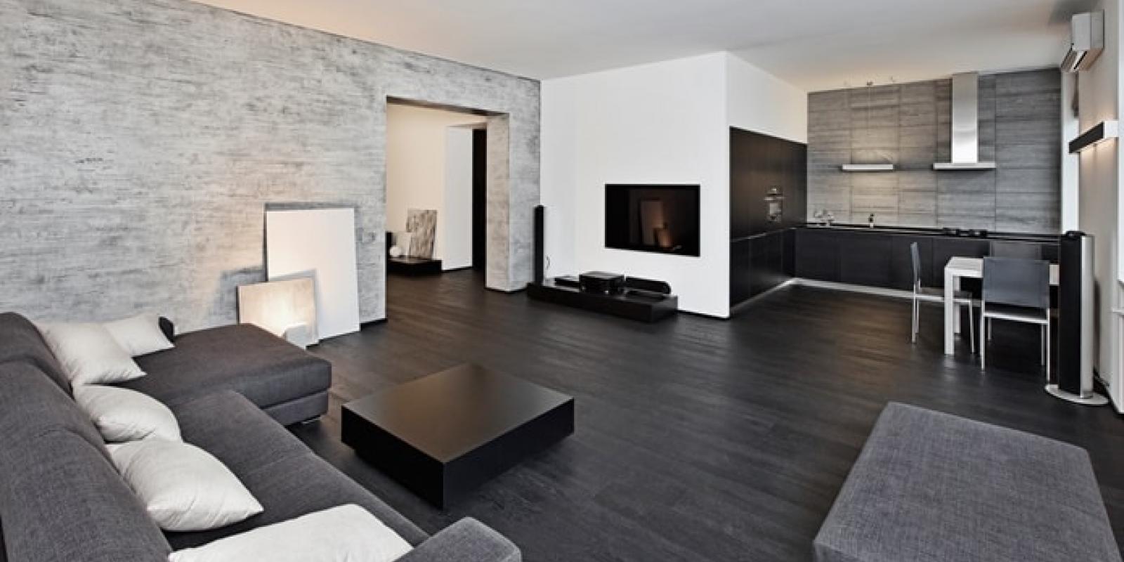 Йому притаманна простота, точність композиції, лаконічність обстановки і мінімальний декор. Освітлення багаторівневе, колірна палітра нейтральна, меблі корпусні, без декоративних елементів. Завдяки грамотному зонуванню створюється комфортна обстановка, не позбавлена своєрідності.