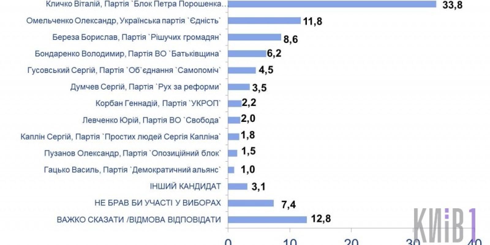 Серед кандидатів на посаду міського голови Києва в симпатіях виборців очікувано лідирує Віталій Кличко (за нього б проголосувало 33,8% опитаних). Олександр Омельченко отримав би підтримку 11,8% киян, Борислав Береза – 8,6%, Володимир Бондаренко – 6,2%, Сергій Гусовський – 4,5%, Сергій Думчев – 3,2%, Геннадій Корбан – 2,2%.