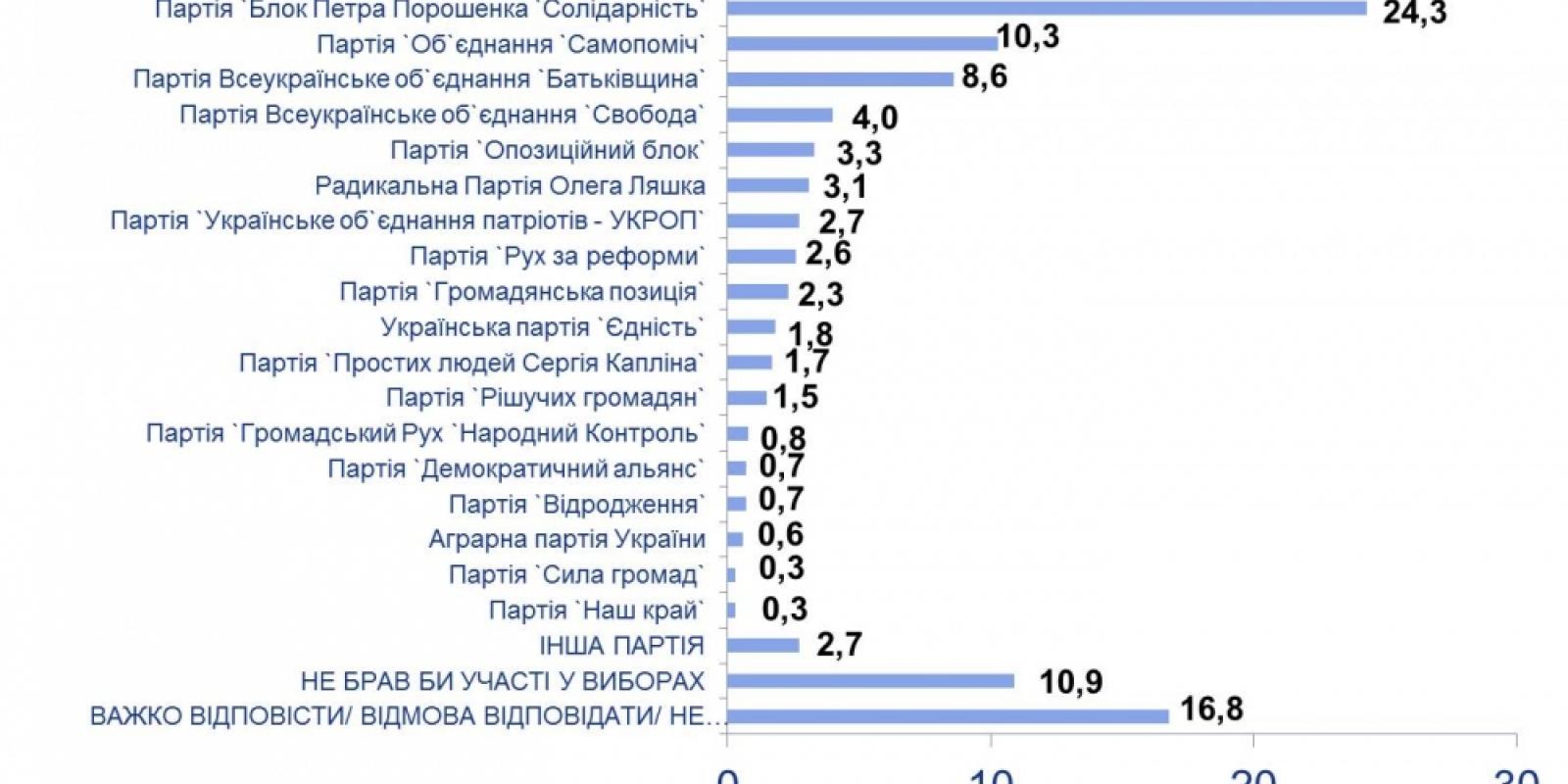 Лідером симпатій киян серед політичних сил є Блок Петра Порошенка "Солідарність" (24,3%). Далі – зі значним відривом – Об’єднання "Самопоміч" (10,3%), ВО "Батьківщина" (8,6%), ВО "Свобода" (4,0%), "Опозиційний блок" (3,3%), Радикальна партія Олега Ляшка (3,1%), УКРОП (2,7%), "Рух за реформи" (2,6%). Не визначилися зі своїми політичними симпатіями – 16,8% з опитаних.