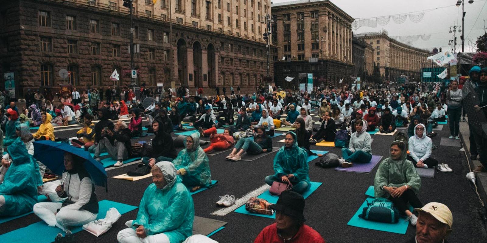 Для проведення заходу практично на весь день перекрили Хрещатик для проїзду транспорту. Збір усіх учасників розпочався о 17:00 біля ЦУМу. Для досягнення внутрішньої гармонії зібралось майже 400 осіб, який не злякали ніякі погодні умови. Прямо на холодному асфальті вони розстелили каремати, а від дощу рятувалися дощовиками. І те, і інше організатори роздавали на місці.