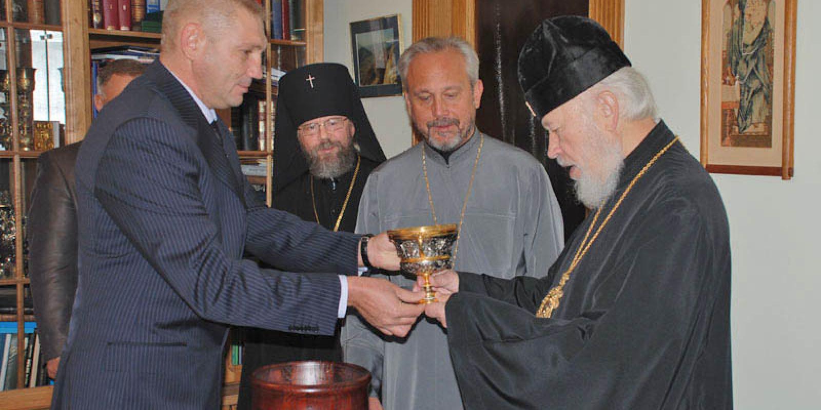 Як повідомили в прес - службі Київської міської державної адміністрації , у своїй резиденції в Свято- Пантелеймонівському монастирі в Феофанії Предстоятель подякував за допомогу в організації ювілейних святкувань та нагородив орденами 1025- річчя Хрещення Київської Русі голови КМДА Олександра Попова та секретаря Київради - заступника Київського міського голови Галину Герегу .